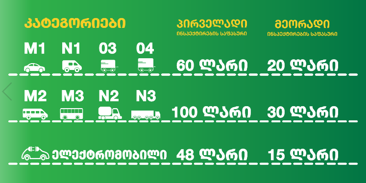 2023 წლის 1 თებერვლიდან 8-ზე მეტი დასაჯდომი ადგილის მქონე ავტოსატრანსპორტო საშუალებებისა და 3500 კგ-ზე მეტი სრული მასის მქონე, ტვირთის გადასაზიდად განკუთვნილი ძრავიანი ავტოსატრანსპორტო საშუალებებისთვის ტექინსპექტირება 100 ლარი, განმეორებითი ინსპექტირება 30 ლარი ეღირება; დანარჩენ შემთხვევებზე პირველადი ინსპექტირების საფასური 60 ლარია, განმეორებითის 20 ლარი.