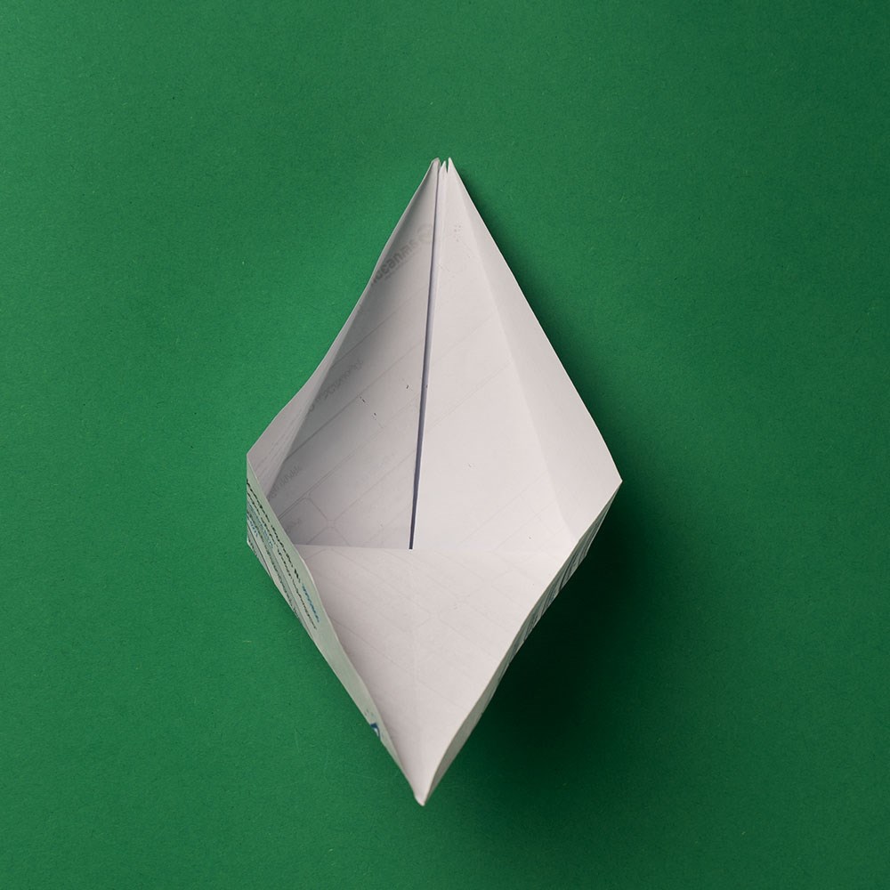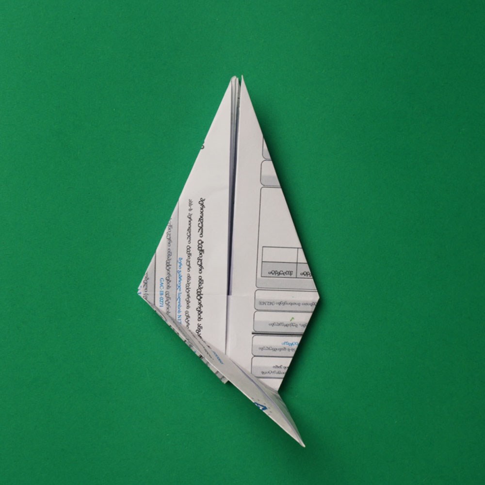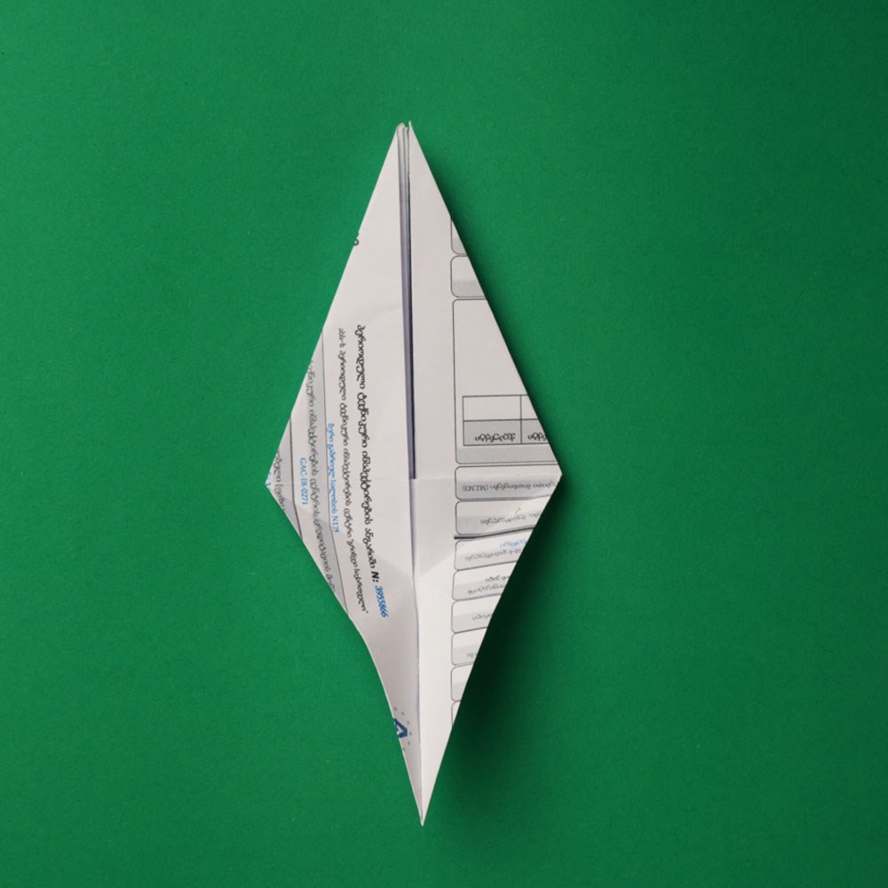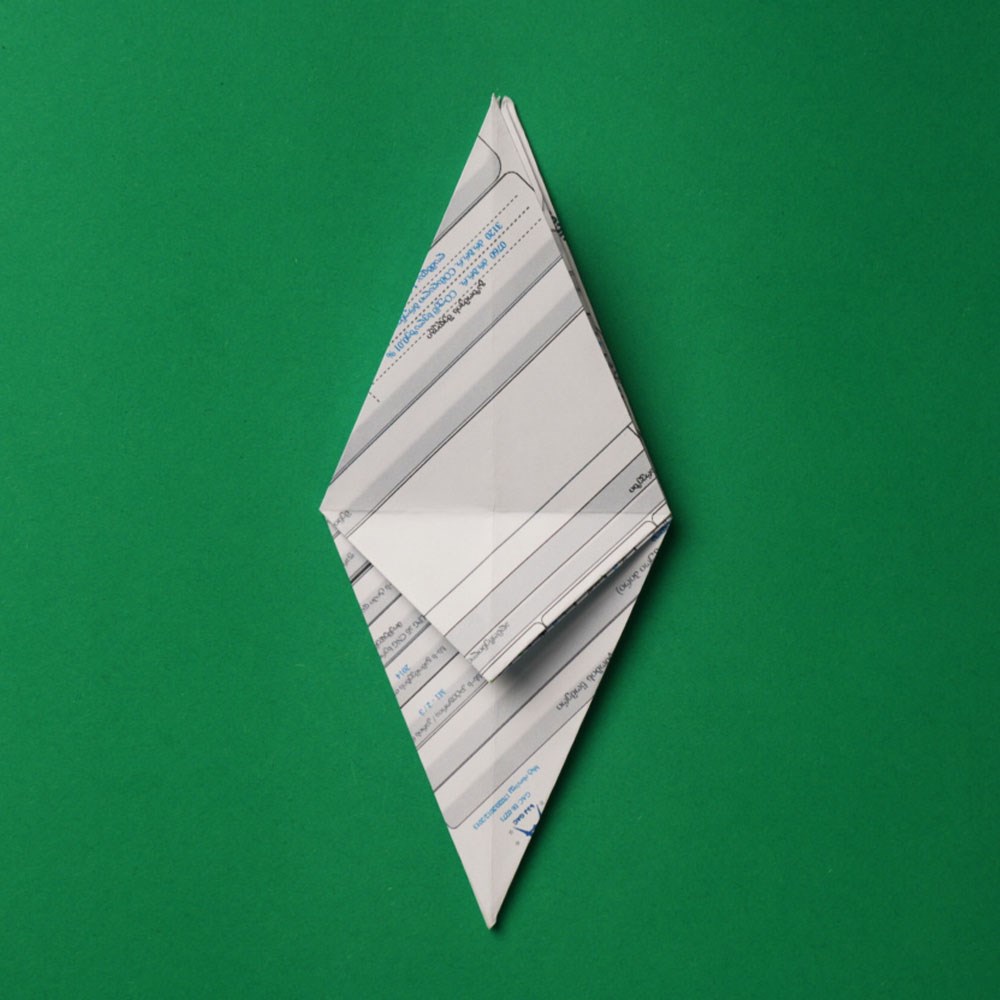 რომბის ზედა და ქვედა შრეებზე გააკეთეთ გადანაკეცი ფიგურის „შიდა“ მიმართულებით, ზუსტად ისე, როგორც ამას ბავშვობაში, ქაღალდის თვითმფრინავის შექმნისას აკეთებდით