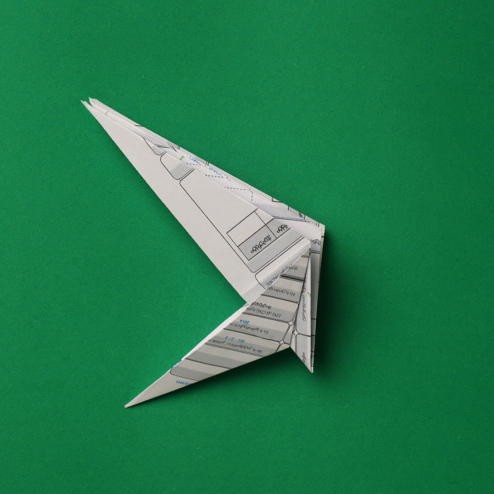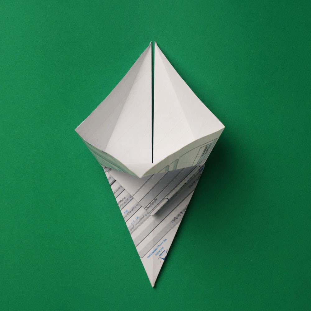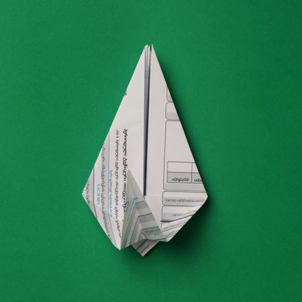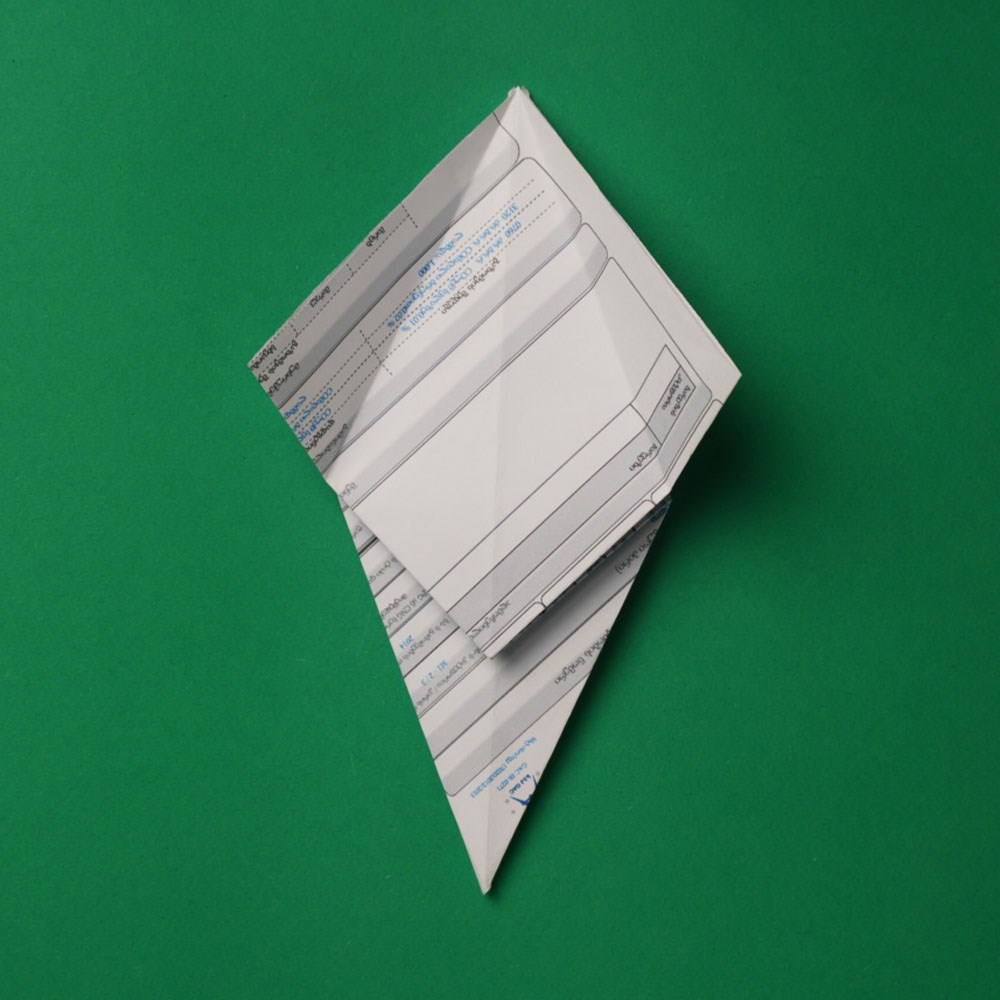 რომბის ზედა და ქვედა შრეებზე გააკეთეთ გადანაკეცი ფიგურის „შიდა“ მიმართულებით, ზუსტად ისე, როგორც ამას ბავშვობაში, ქაღალდის თვითმფრინავის შექმნისას აკეთებდით