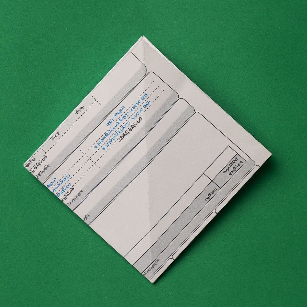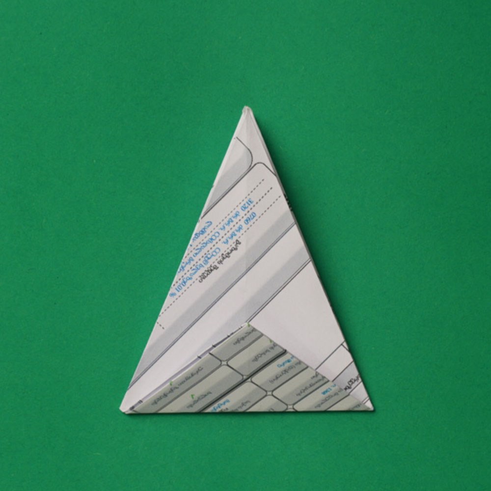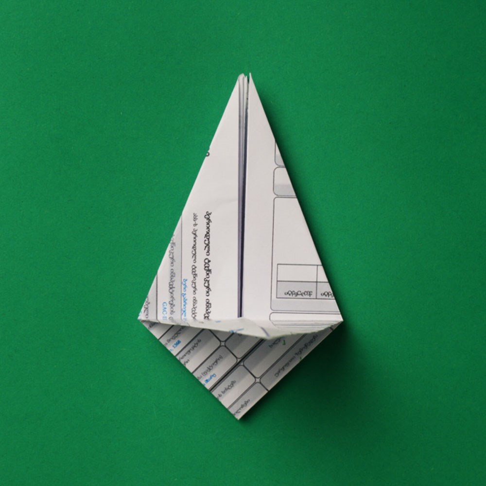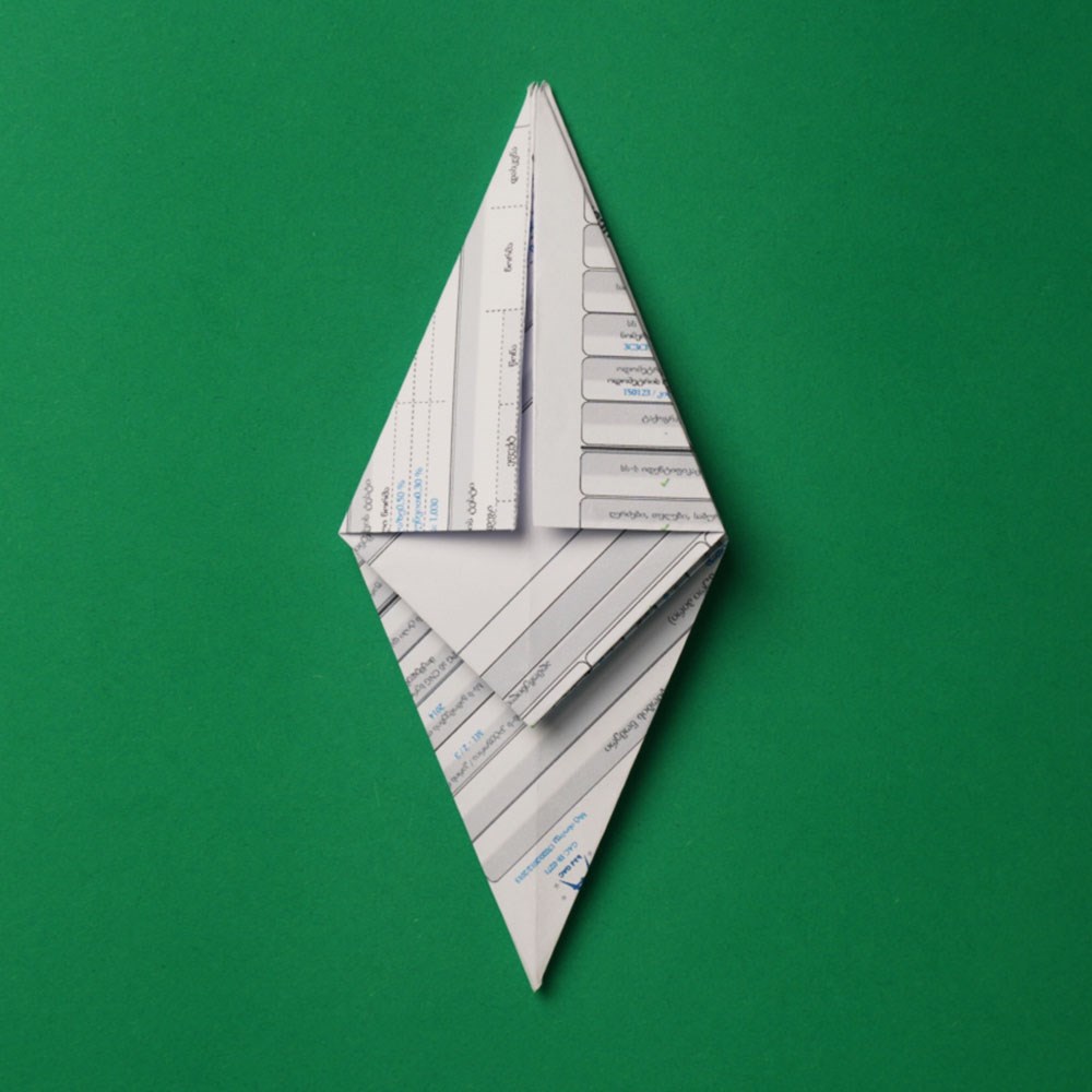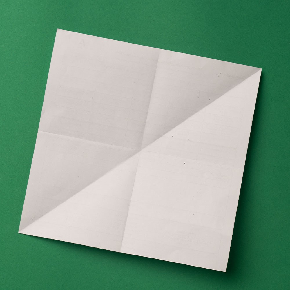 „ამოკეცვის“ შედეგად, თქვენ მიიღებთ საწყისი ფურცლის მეოთხედი ზომის მქონე „ოთხფენოვან“ კვადრატს, რომელიც უნდა დაატრიალოთ 45 გრადუსით და ზედაპირზე განათავსოთ, როგორც რომბი.